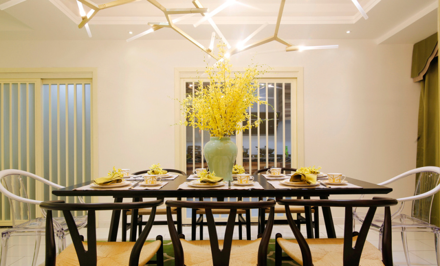 餐桌位于樓梯下方,再一次發(fā)揮了灰+白+黃的搭配,造型獨(dú)特的餐桌和餐椅彰顯了屋主的獨(dú)特個(gè)性。