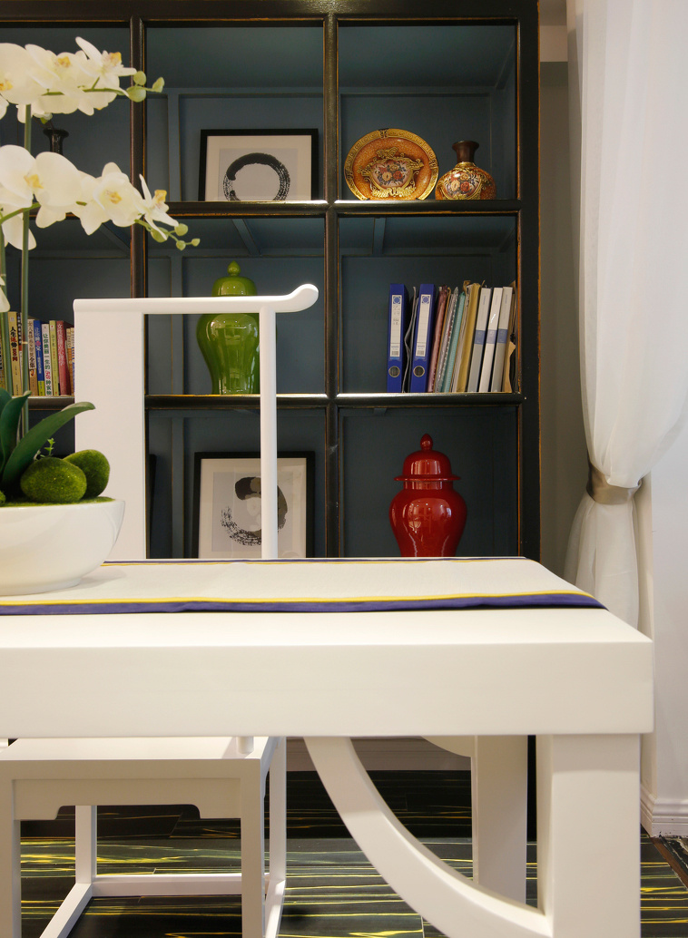 休息室看上去更像是屋主的個(gè)人家具展覽空間,天藍(lán)色的墻面,深藍(lán)色的柜面,搭配黃色木架,造型奇特的地墊,姜黃色與寶藍(lán)色搭配的天鵝絨沙發(fā),鮮明的色彩對(duì)比讓這里活力四射,更是將黃與藍(lán)的搭配從客廳延伸至室內(nèi),角落的儲(chǔ)物柜上擺放著屋主心愛的“寶貝”,分別是產(chǎn)自上世紀(jì)六十年代的臺(tái)燈和寶藍(lán)色印花陶瓷花瓶,都是屋主從古董店淘回,擺放于此,彰顯個(gè)人品味。