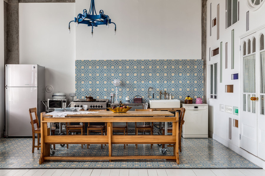 Loft最大的特點在于寬敞及開放式的空間,客廳的公共區(qū)域內(nèi)包含了廚房與餐廳。用一整面花磚地板來區(qū)分不同的功能區(qū)域,將花磚延續(xù)到墻面上形成很美的視覺效果。