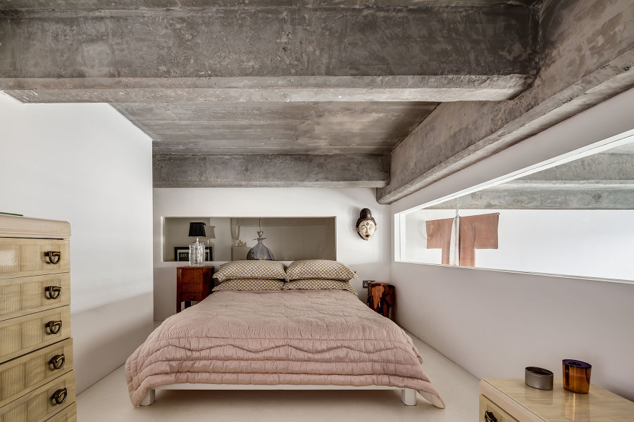 這棟兩層樓的住宅很好的將公共區(qū)域和私人區(qū)域分開,二樓以臥室為主。臥室中奶油色的空間搭配混凝土天花板,保留了部分Loft的原始結(jié)構(gòu),選擇粉色床上單品讓空間增添一絲浪漫。充滿異國情調(diào)的裝飾與小型器皿為復(fù)古家具增色不少,臥室保持了一貫的舒適風(fēng)格。
