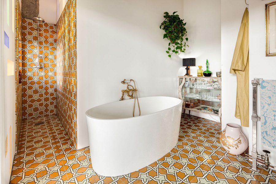 一樓的浴室延續(xù)了整體的復(fù)古情調(diào),將花磚運用于其中,帶來意想不到的效果。密鋪花磚將視覺感延伸,大膽的色彩結(jié)合濃烈的圖案,讓衛(wèi)浴區(qū)活潑起來,打破一般以白色浴室的單調(diào)刻板印象。