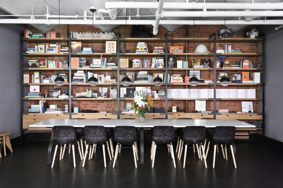 以紅磚為背景,利用鐵件和木元素定制出整面墻的書架,豐富的書籍成為了這暗色空間中最搶眼的點綴。
