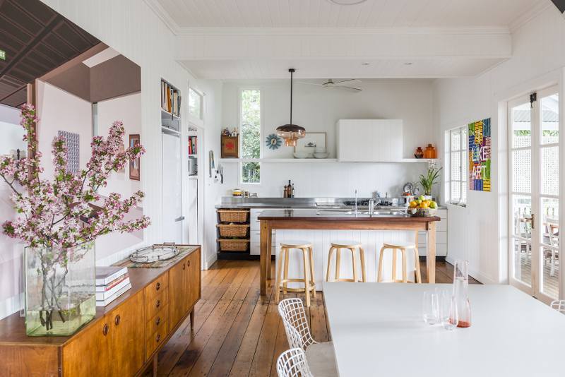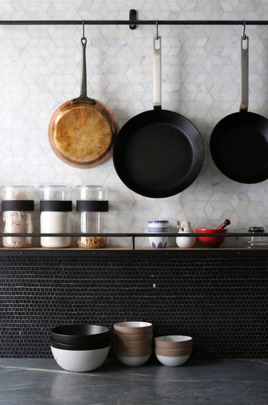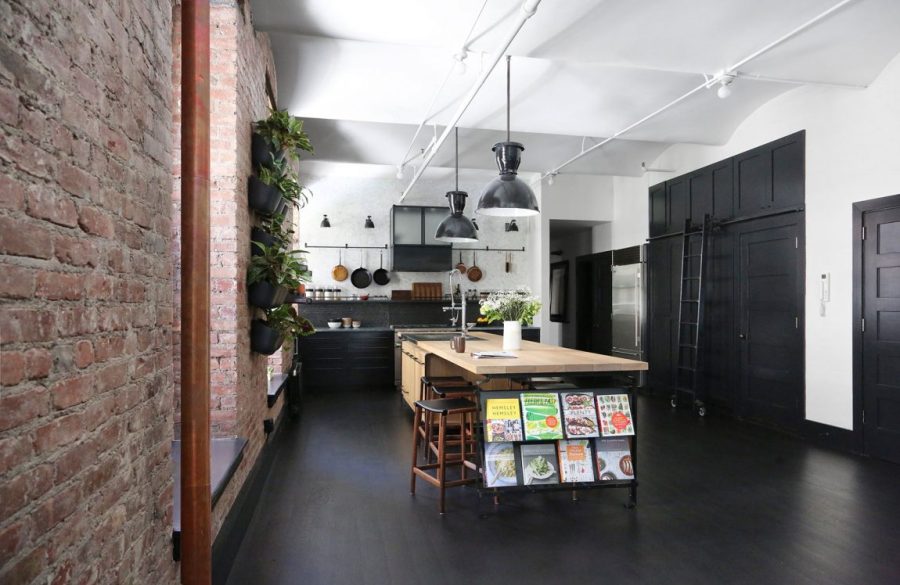 開放式的布局讓各功能區(qū)顯得十分靈活,廚房位于空間一角,大膽的采用黑色調(diào)與木質(zhì)元素搭配,讓冷與暖,輕盈與厚重互相沖撞。同時墻壁上的綠植,中島吧臺上擺放的書籍,很好的調(diào)和了原先的氣氛,在簡潔的工業(yè)空間中不失活力與趣味。