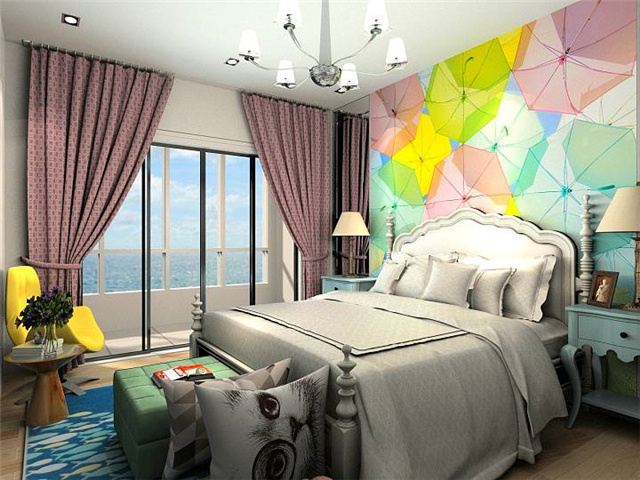 沖擊力十足的彩色雨傘壁紙統(tǒng)領(lǐng)了全屋的色彩,靠背椅、地毯、窗簾、燈具與床頭柜的顏色,都與壁紙呼應(yīng)。