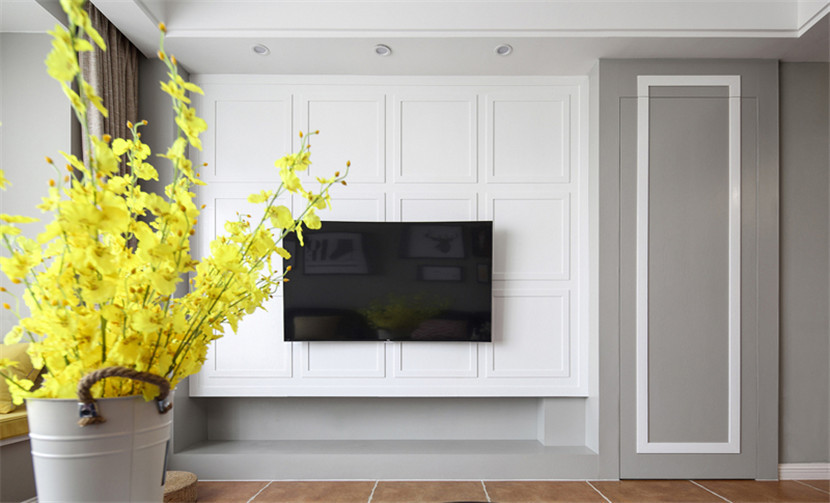 客廳電視背景墻的墻體敲除,利用柜子與書房隔斷,既能儲物又能分區(qū),一舉兩得。