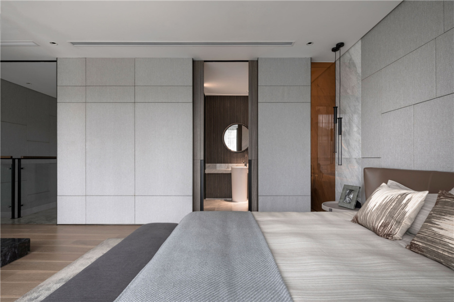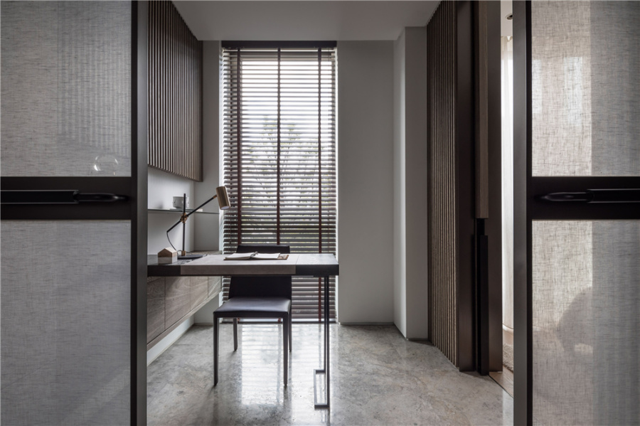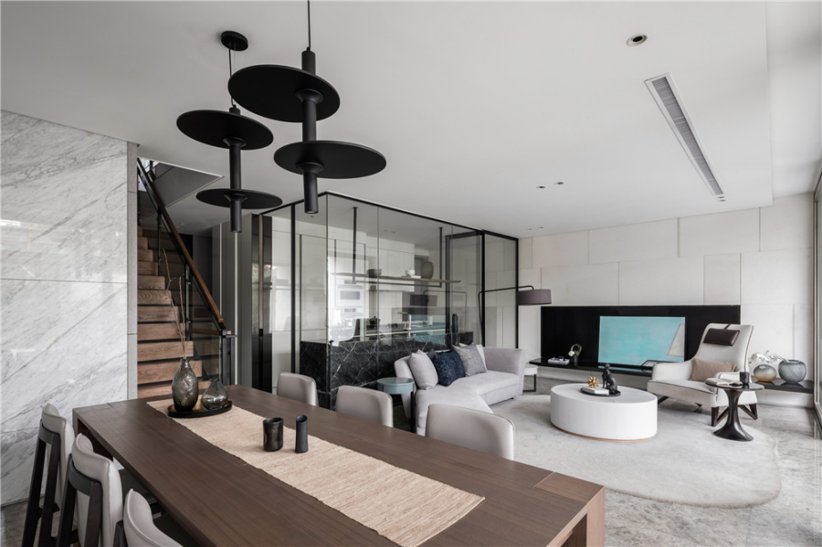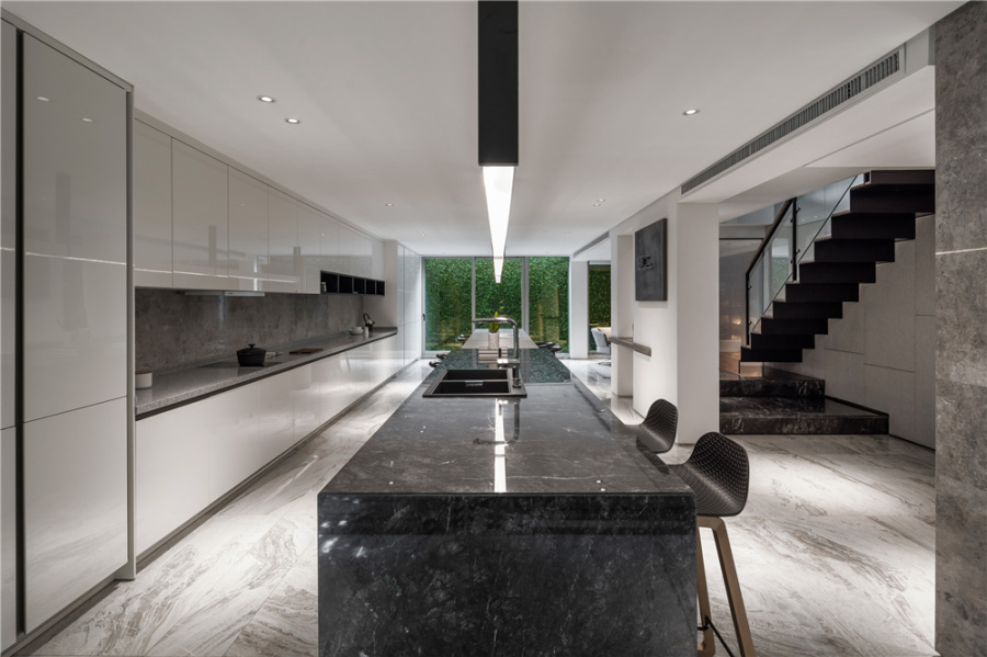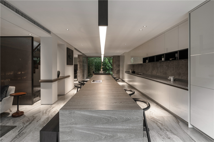 將畫面轉(zhuǎn)到義烏,在山明水秀、人文薈萃的義烏,希望將室內(nèi)建筑形成一個輕盈的載體,去乘載居室中的人文氣韻。我們屏去厚重的墻體、將廚房打造成景觀廚房,使作菜時光入景怡情。地下層的宴客廳也和天井綠植墻產(chǎn)生親密的關(guān)聯(lián),使綠的蹤跡流淌在家的每一處角落、入畫。