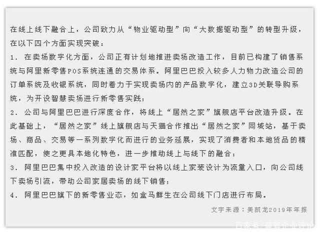 其中,也許由于阿里注資更早的關系,居然之家的計劃更加亮眼。居然之家一方面從“物業(yè)”向“大數據”驅動,進行窗口和系統(tǒng)改造。另外,也在合作中逐漸摸索上了從大家居向綜合零售、大消費板塊的道路。下一步計劃,居然之家將會融合家居與建材裝飾、綜合超市、餐飲院線,將實體網絡進行立體改造。雖然目前看來,從“家”到“加”還需要時間。