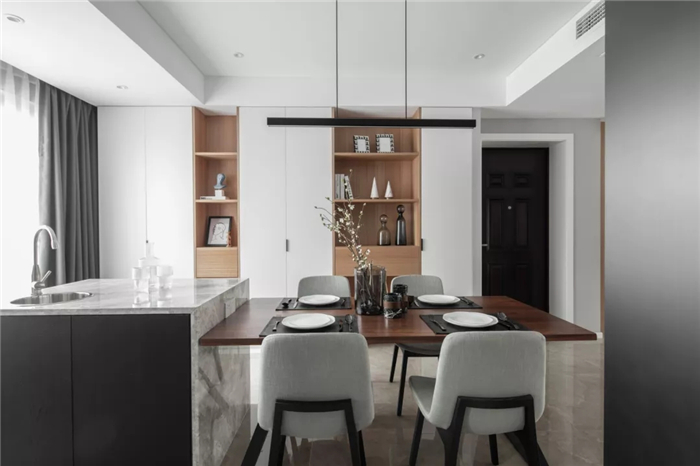 入戶沒(méi)有玄關(guān)走廊的戶型,直接在入戶門的側(cè)方做到頂?shù)墓褡?,也作為餐邊柜使用。餐桌靠著一個(gè)中島臺(tái)來(lái)擺放,大理石與木質(zhì)的結(jié)合,顯得優(yōu)雅大方。