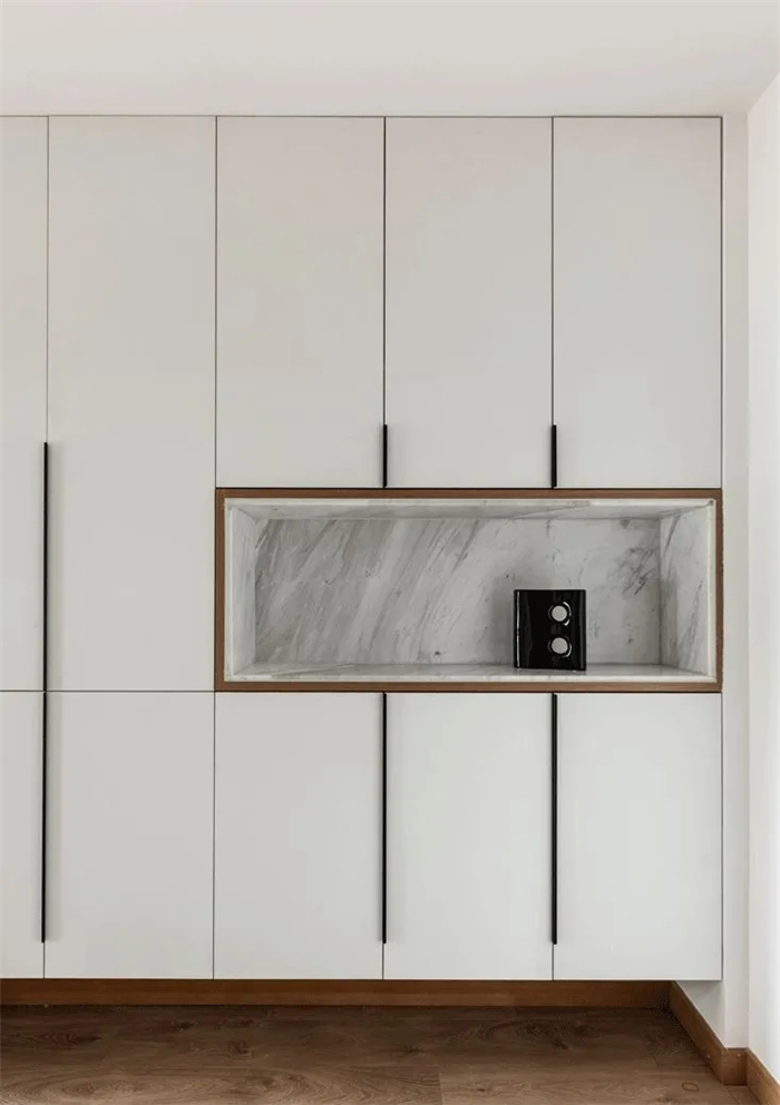 定制柜中間留空使用了質(zhì)感美觀的大理石紋板材,底下懸空放置常穿的鞋。玄關(guān)與室內(nèi)以輕體墻形成分隔。