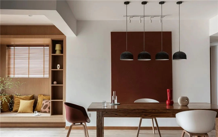 餐廳紫砂色的抽象定制油畫(huà)讓留白的空間多了一絲厚重的故事感,極簡(jiǎn)的實(shí)木餐桌搭配HAY的圍裹型餐椅,白色,紫砂色,慵懶舒適之中又透露出一絲克制。