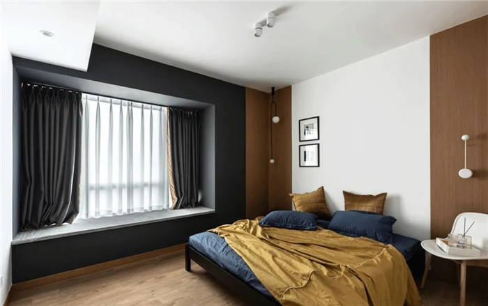主臥室的收納被放在了床尾處,到頂?shù)陌咨褡?,在角落處留出部分的黑色空間作為書(shū)房,滿足屋主的日常使用需求,又能避免太過(guò)單調(diào)。