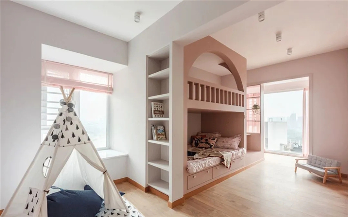 粉色調(diào)的公主房,不同的粉融合在一起,并不甜膩,反而因?yàn)榻鈽?gòu)主義,多了一絲理性之美。落地窗讓這個(gè)兒童房采光極佳,陽(yáng)光就是主角。