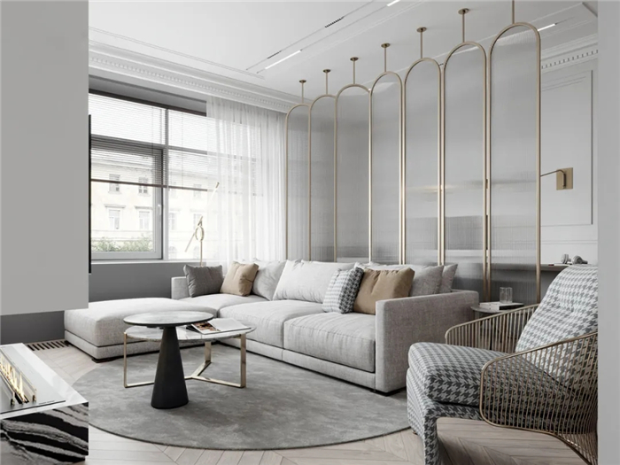 與沙發(fā)后的屏風(fēng)隔斷形成呼應(yīng)