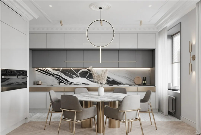 廚房與客廳之間的分區(qū)元素也可以是一個(gè)功能部分——餐廳。將餐桌和餐椅放置在兩個(gè)空間的連接處,不僅可以使空間設(shè)計(jì)更顯連貫,還可以為廚房起到一定的緩沖作用。