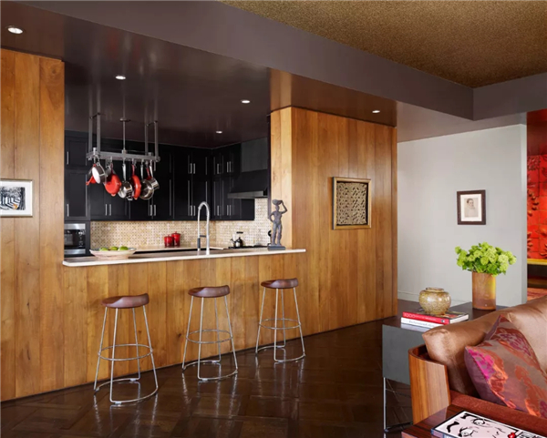 吧臺(tái)的一端與墻壁相連接,這樣可以非常清晰的劃分出廚房與客廳的邊界,你可以把它打造成一個(gè)小的餐桌,早上在這里打一杯咖啡或者吃個(gè)簡(jiǎn)餐。