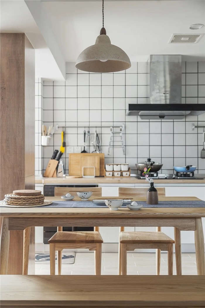 白色小方磚與原木的搭配,堪稱經(jīng)典,打造清新舒適的日式廚房風(fēng)格,同時(shí)通過超大空間吊柜、超大操作臺(tái)的設(shè)置,使得整個(gè)廚房空間通透明快,且便于日常備餐操作。