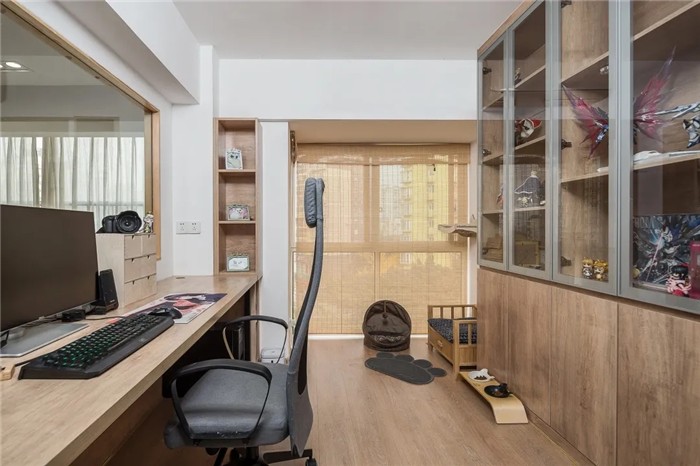 書房?jī)?nèi)設(shè)置了一整面的置物柜,里面規(guī)整地陳列著屋主的手辦收藏,成為空間內(nèi)的一種裝點(diǎn)。