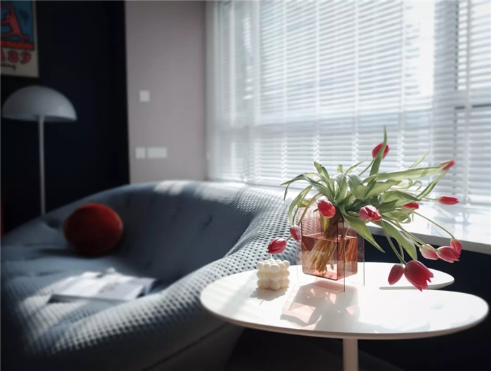 空間色塊的構(gòu)成,趣味而又均衡。飄窗單獨(dú)刷粉灰空間構(gòu)成更加的立體,深藍(lán)色塊延伸到客廳裝飾墻,與留白的墻面,藍(lán)白相間,營(yíng)造出空間干凈明快的基調(diào)。