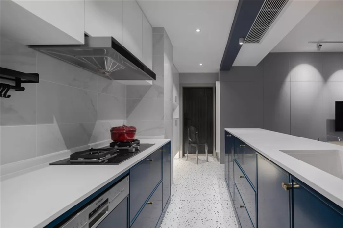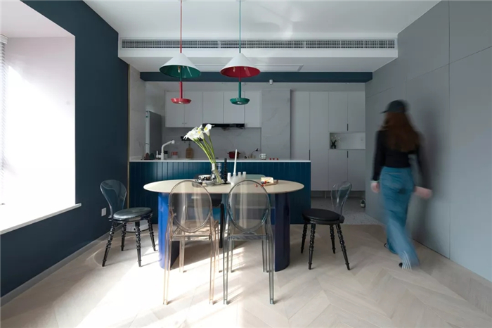 原始廚房與餐廳之間有一根40cm的梁,為了盡量保證層高,廚房區(qū)域吊頂均采用30cm高度,一是為了包平廚房與入戶之間的梁,二是為了風(fēng)管機(jī)位置的安放。裸露出來的梁刷深藍(lán)色,反而跟櫥柜之間有了呼應(yīng),增添了空間的趣味構(gòu)成感。