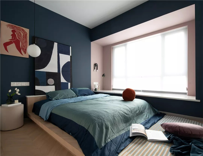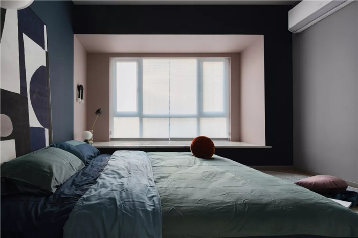 在色彩搭配上,選用讓人比較沉靜、有助于睡眠的深藍(lán),作為臥室的主基調(diào),再配以安寧溫暖的橡皮粉作為輔色,同時(shí)白色柜體減少了空間的擁堵感,讓空間色調(diào)也更為的明快。
