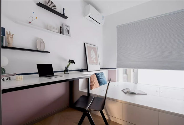 書房則與次臥色調(diào)相反,臟粉半墻點(diǎn)綴深藍(lán)邊帶,空間簡(jiǎn)潔而溫馨。