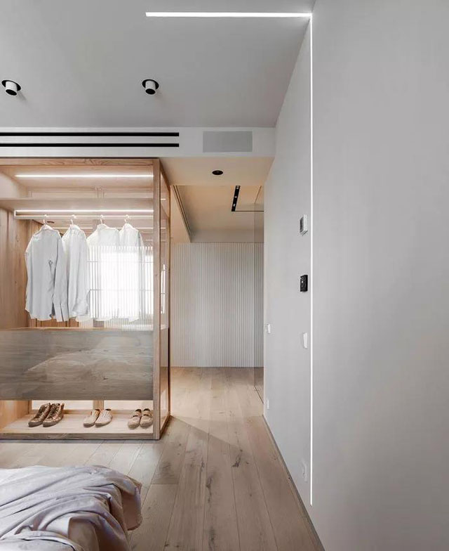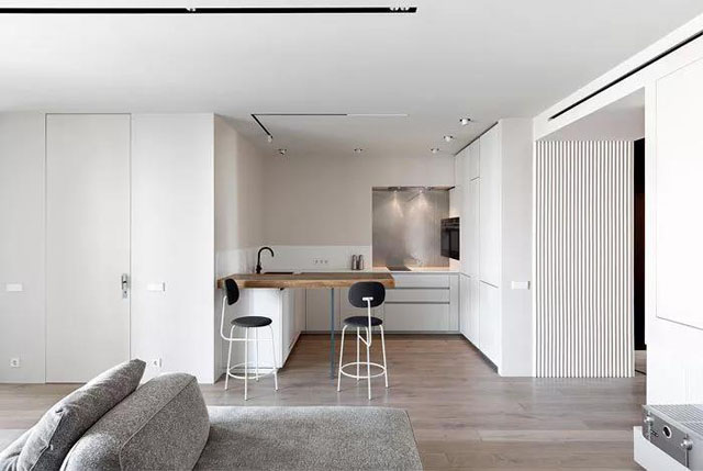 浴室配有Rimadesio滑動鏡門,因此浴室的燈光將突出客廳區(qū)域并使公寓的北部變亮。緊湊的廚房區(qū)與起居室相連。最后,整個公寓只剩下兩扇門 - 在廁所和入口處,在空間中沒有留下黑暗的角落。衣柜可以從入口區(qū)域和臥室使用,在視覺上將臥室和走廊分開。