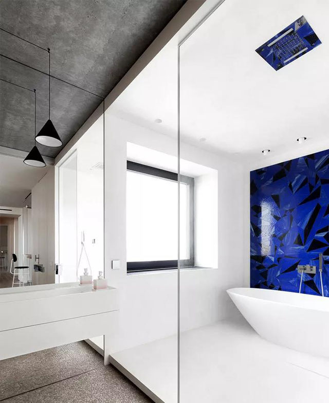 由于客戶決定單獨(dú)設(shè)置浴室和衛(wèi)生間,建筑師特別注意開發(fā)浴室空間。因此,位于窗戶旁邊的浴缸在白天浸泡,這對于基輔的典型公寓布局來說是非常不尋常的。淋浴區(qū)面向窗戶,因此每天早晨屋主可以在這里開始新的一天時欣賞城市美景。