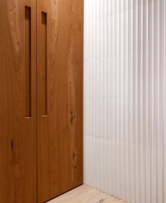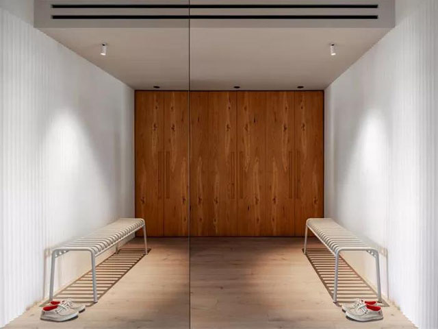 為了在視覺上擴(kuò)展空間,建筑師在公寓里使用了很多鏡子。例如,在L形走廊中,鏡子角反射衣柜,使空間看起來像方形??紤]到建筑物的低天花板,最大的挑戰(zhàn)是規(guī)劃通風(fēng)系統(tǒng)。但只在更衣室降低天花板解決了這個問題。
