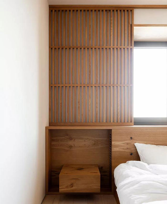 ▲ 臥室床頭利用木質(zhì)格柵起到窗簾作用
