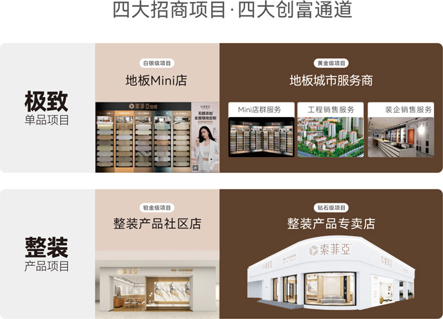 不難發(fā)現(xiàn),索菲亞·墻地一體|空間定制的這次“發(fā)狠招”背后的戰(zhàn)略意圖也很明顯:索菲亞地板Mini店、索菲亞地板城市服務商、索菲亞空間定制社區(qū)店、索菲亞空間定制專賣店,四大招商模塊“四箭齊發(fā)”,終極目的就是:通過地板單品極致化戰(zhàn)略,助力完成空間定制的整裝產(chǎn)品包的核心業(yè)務發(fā)展目標。這也讓合作經(jīng)銷商可以以超低投入,坐擁大品牌,并可獲得事業(yè)長久可持續(xù)發(fā)展的綠色通道。