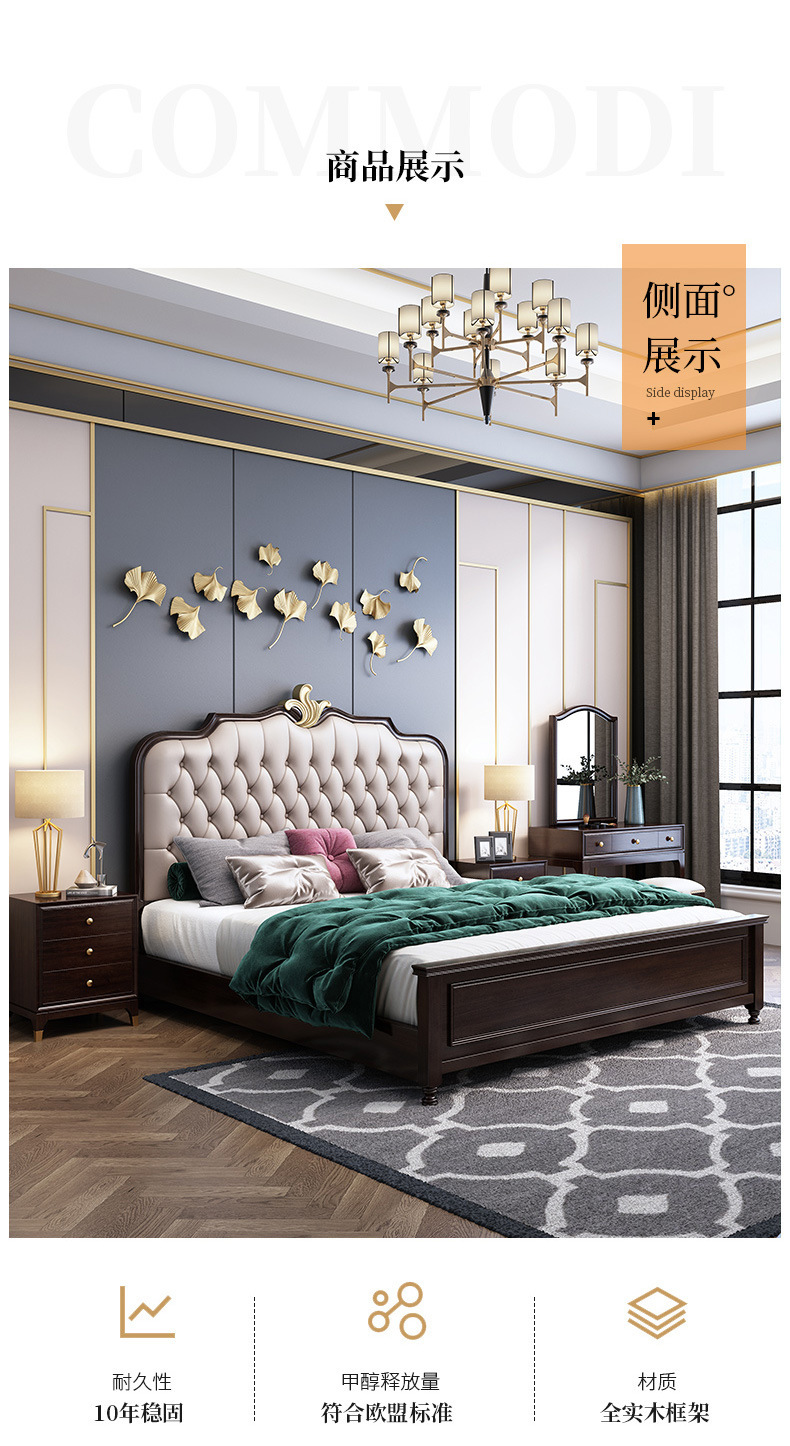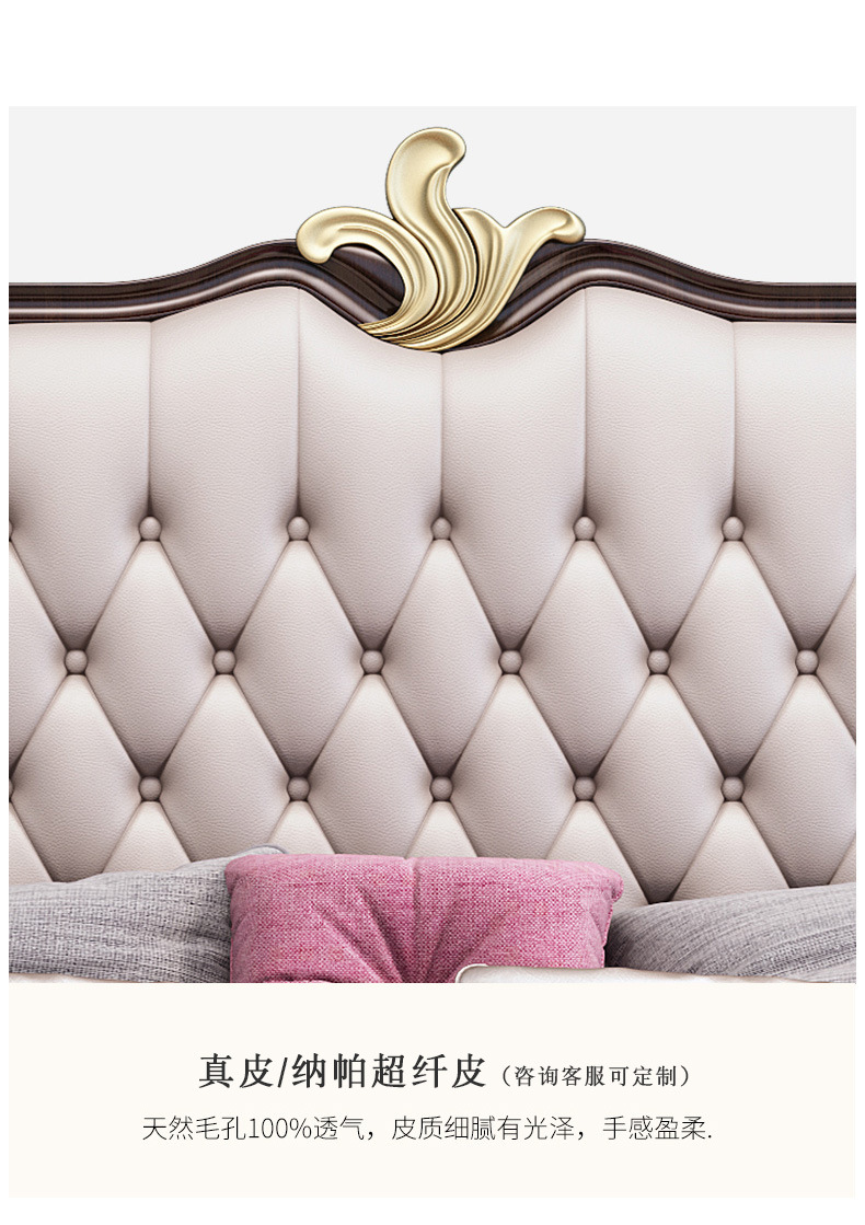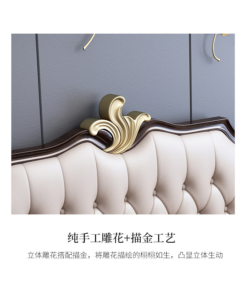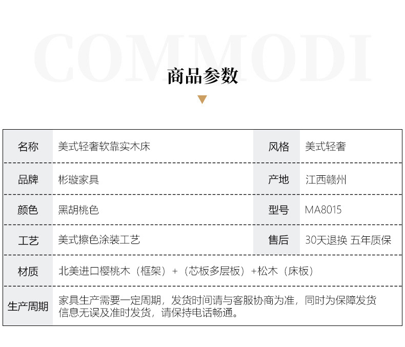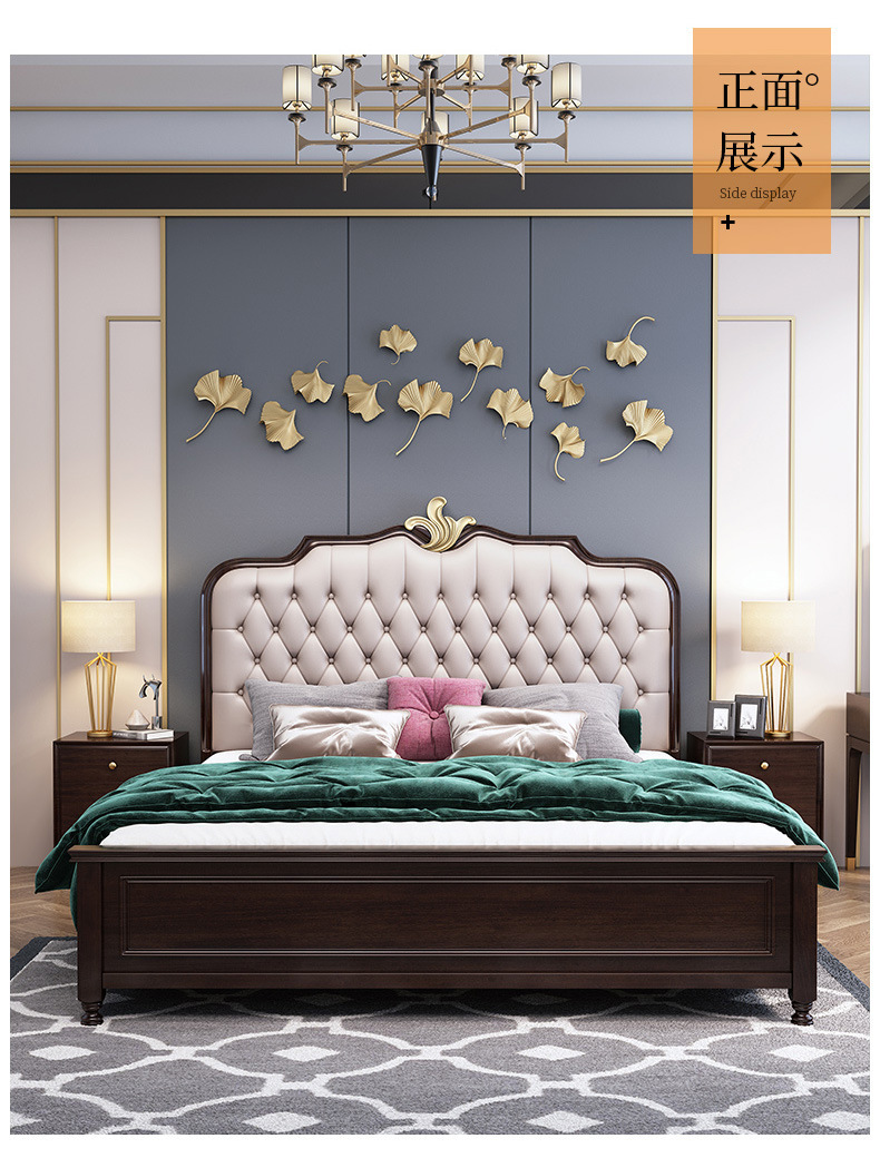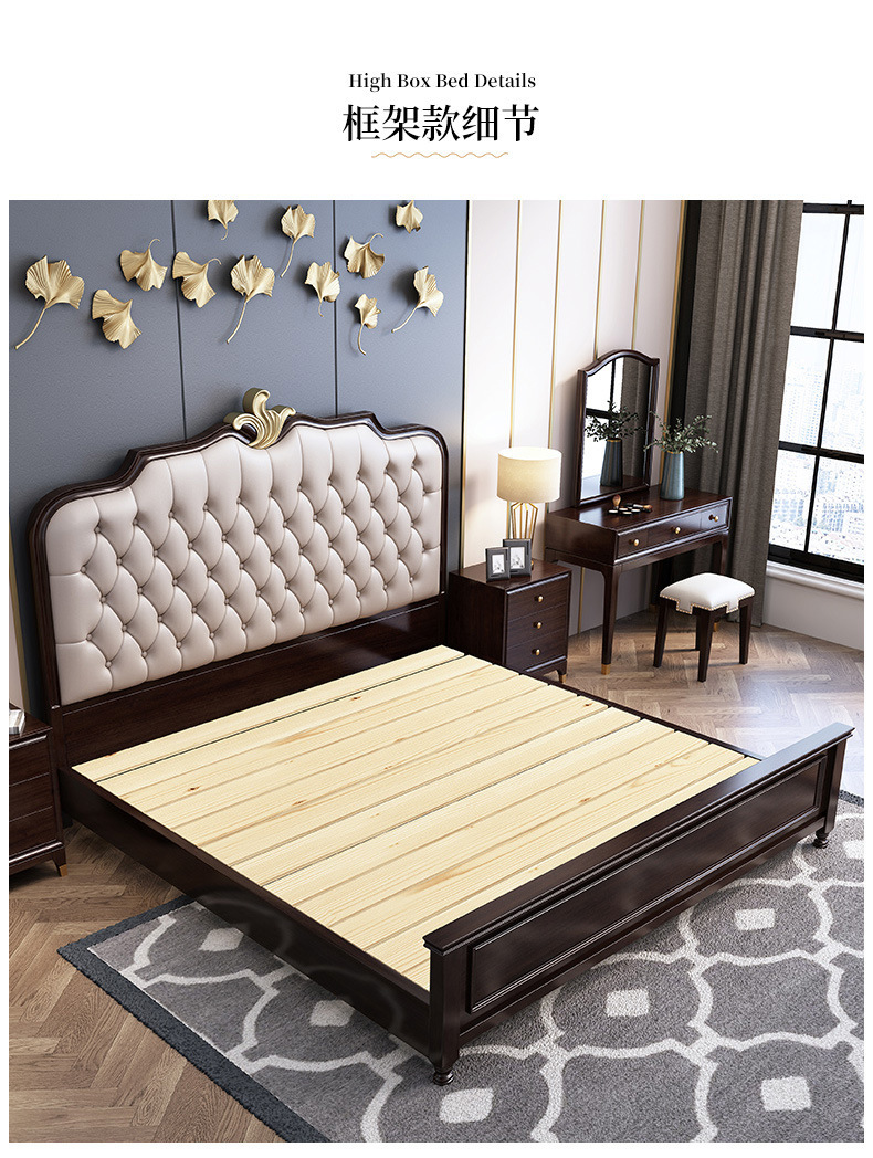 概述:美式輕奢實(shí)木床1.8米雙人簡約主臥1.5婚床高箱儲物櫻桃木金箔家具;材質(zhì):櫻桃木;型號:MA8015;結(jié)構(gòu):框架結(jié)構(gòu)......