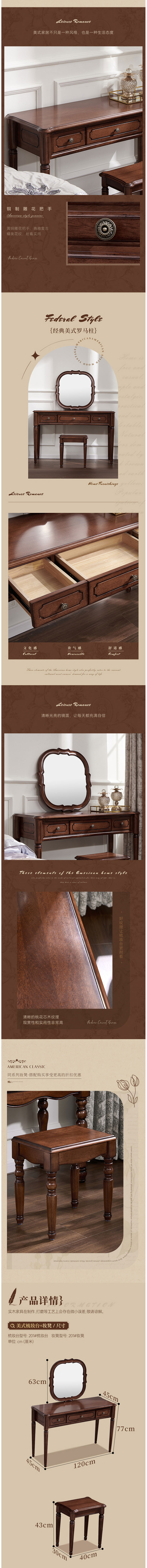 概述:美式實木梳妝臺桃花心單人臥室小戶型化妝桌帶鏡書桌一體收納妝臺;材質(zhì):桃花心木;風格:美式;貨號:201妝臺......