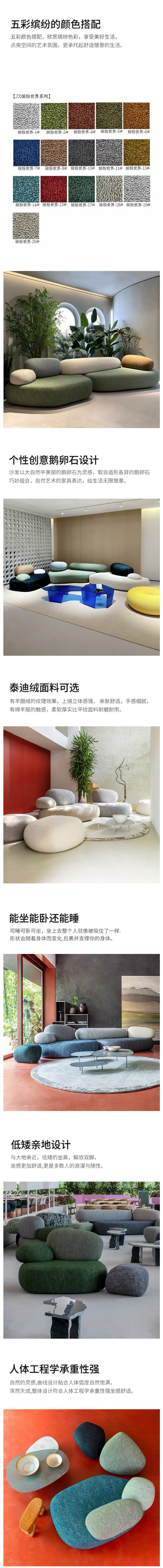 采用獨特的鵝卵石紋理設(shè)計,每一塊沙發(fā)都仿佛是大自然精心雕琢的藝術(shù)品。弧形布局,不僅美觀大方,更能完美貼合人體曲線,提供無與倫比的坐感體驗。精選優(yōu)質(zhì)布藝面料,觸感柔軟,透氣性好,為您打造溫馨舒適的休閑空間。