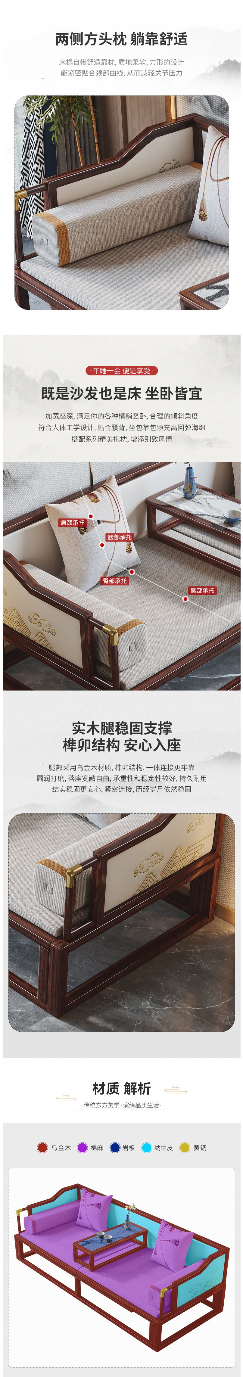 • 新中式實(shí)木羅漢床烏金木沙發(fā)床 多功能禪意榻炕客廳家具 5440元
