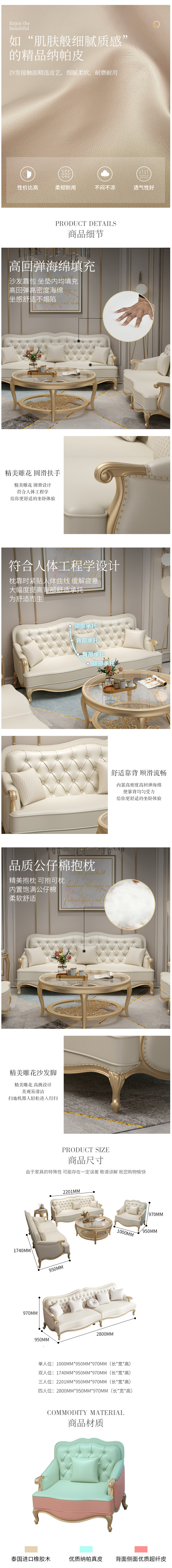概述:美式輕奢實木網(wǎng)紅現(xiàn)代簡約大小戶型客廳123組合歐式真皮別墅沙發(fā); 型號:SF226【A2#沙發(fā)】;風格:美式;沙發(fā)組合形式:U形;皮革材質(zhì):納帕皮;內(nèi)部填充物:高密度海綿;框架:木骨架;......